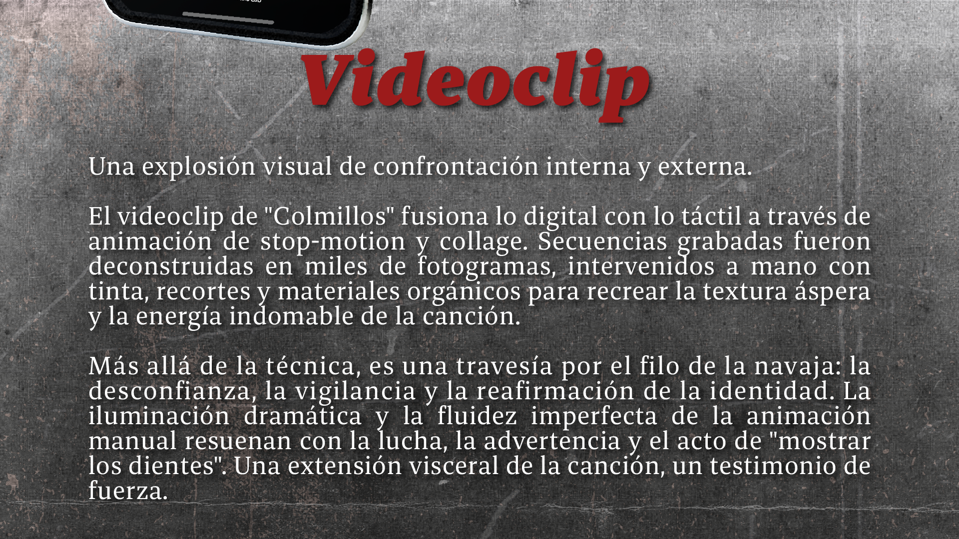 “Colmillos” es una pieza que nace desde la emancipacion, el quiebre y la necesidad de transformar el dolor en arte. Este proyecto reúne dos obras: el cover art y el videoclip oficial, ambas concebidas como manifestaciones visuales de una misma emoción: el colapso interno que precede a la liberación.