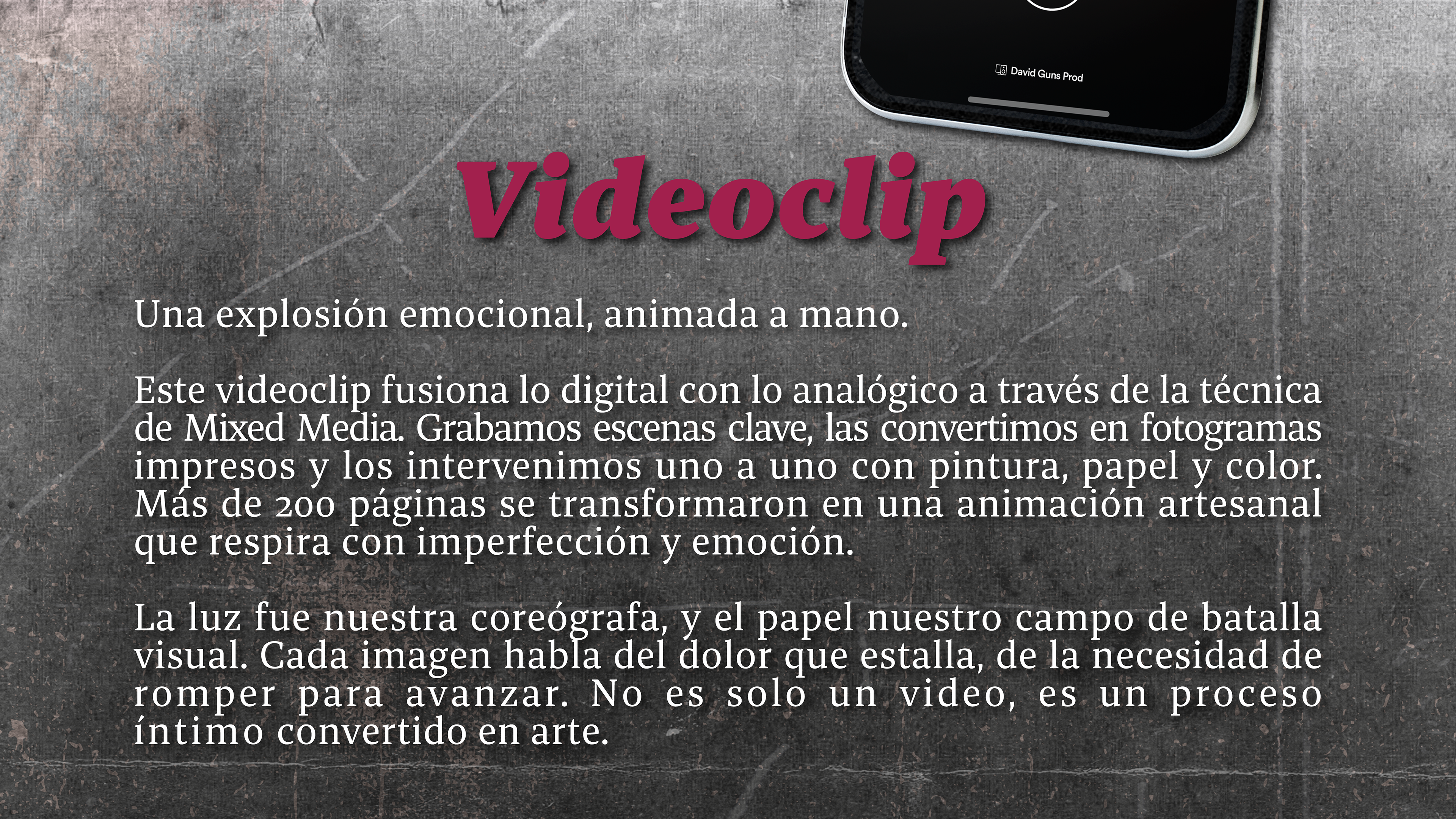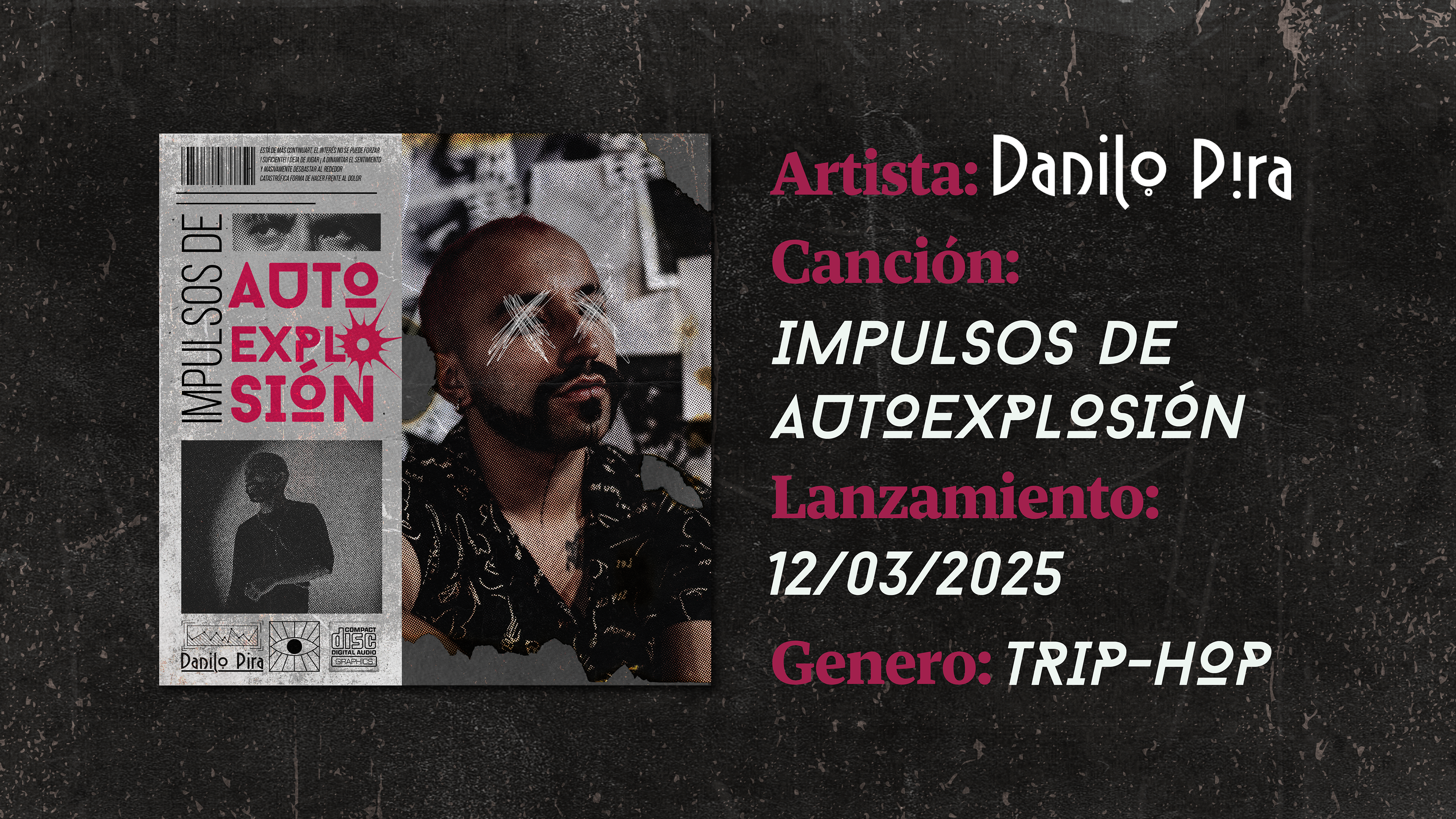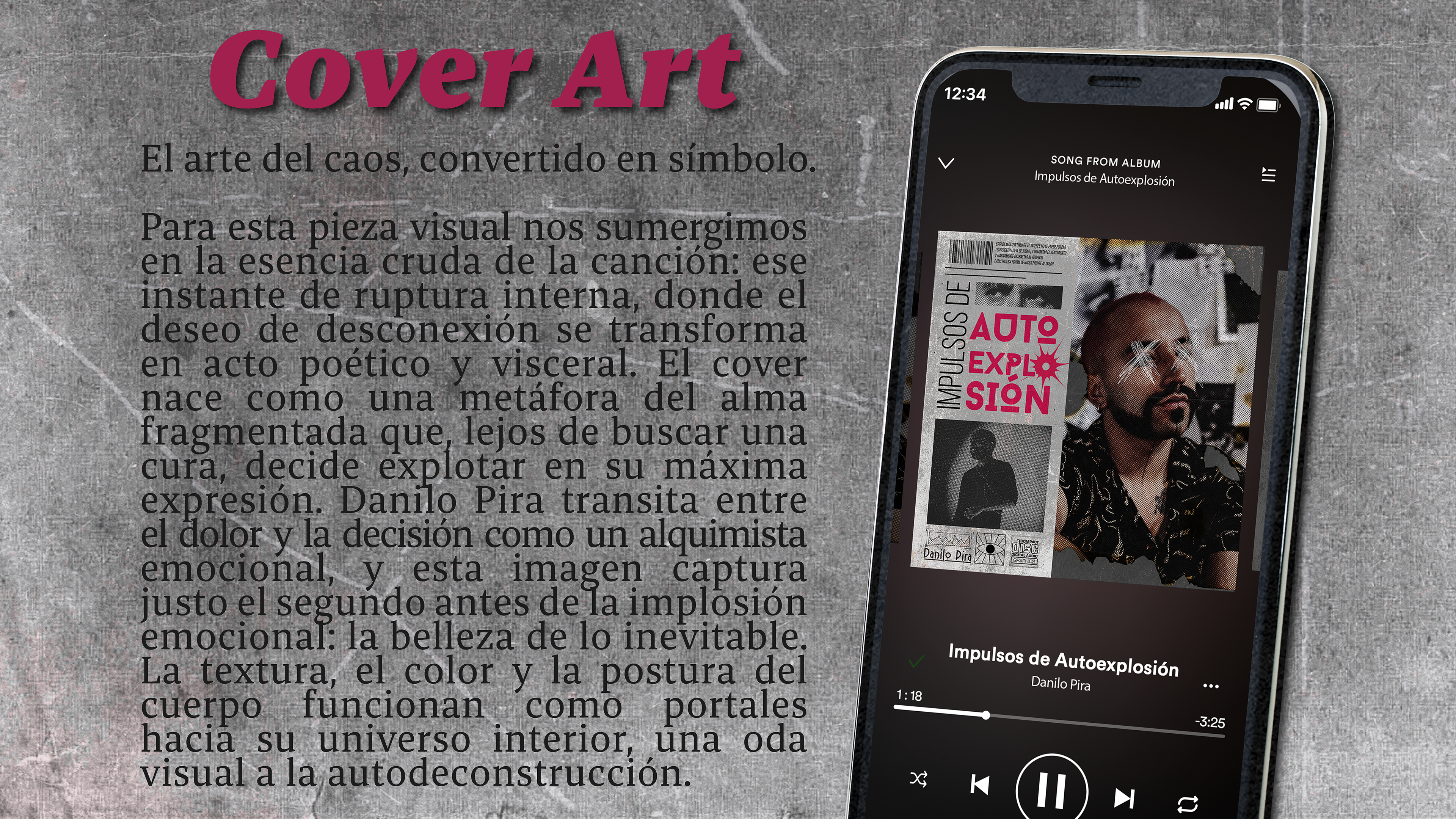 “Impulsos de Autoexplosión” es una pieza que nace desde la introspección, el quiebre y la necesidad de transformar el dolor en arte. Este proyecto reúne dos obras: el cover art y el videoclip oficial, ambas concebidas como manifestaciones visuales de una misma emoción: el colapso interno que precede a la liberación. La dirección creativa explora conceptos como la autodeconstrucción, la tensión emocional y la belleza de lo visceral. Usamos técnicas de mixed media, intervención manual y recursos cinematográficos para traducir en imagen lo que la canción expresa en sonido. El resultado: una experiencia que va más allá de lo musical, donde lo gráfico, lo performático y lo artesanal se encuentran para contar una historia desde las ruinas emocionales hacia la reconstrucción.